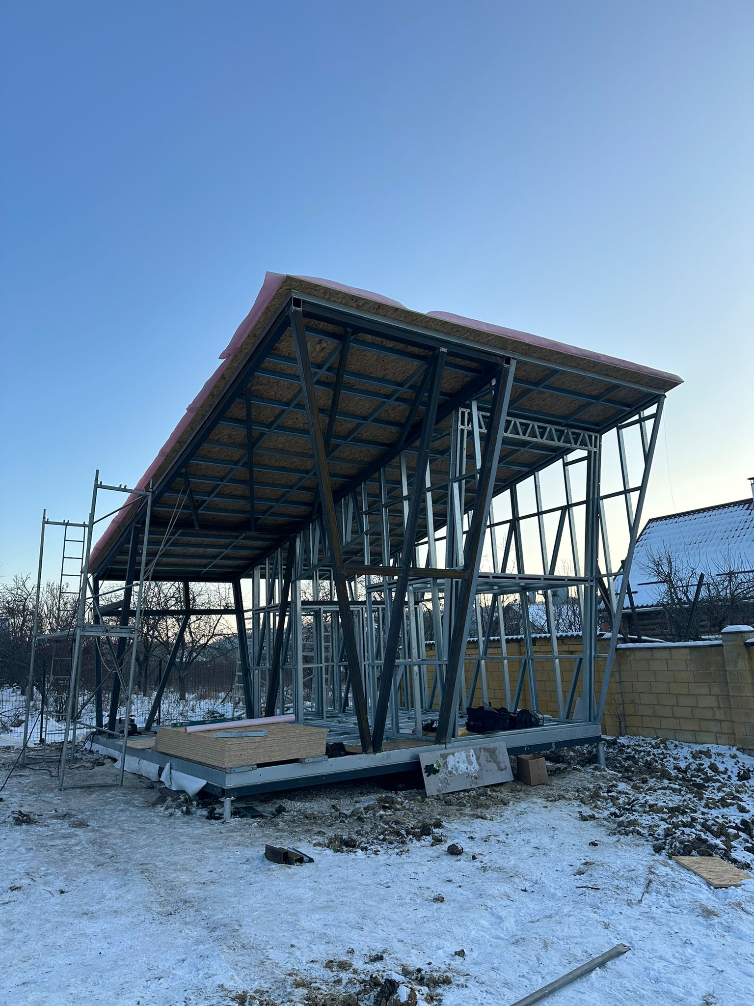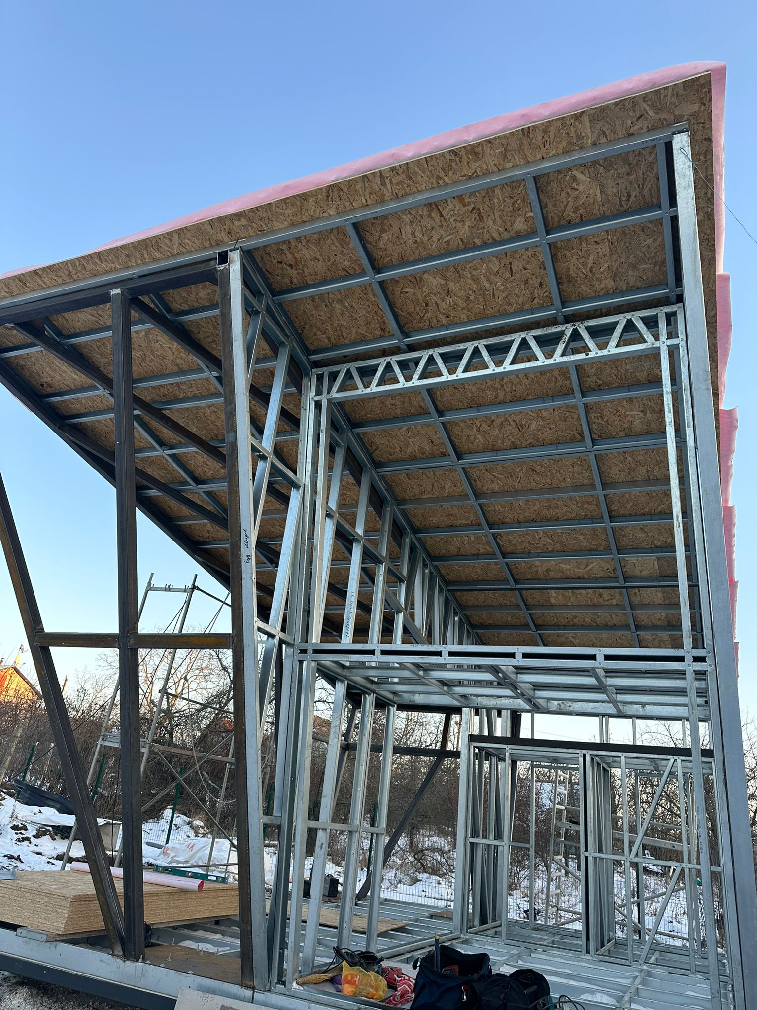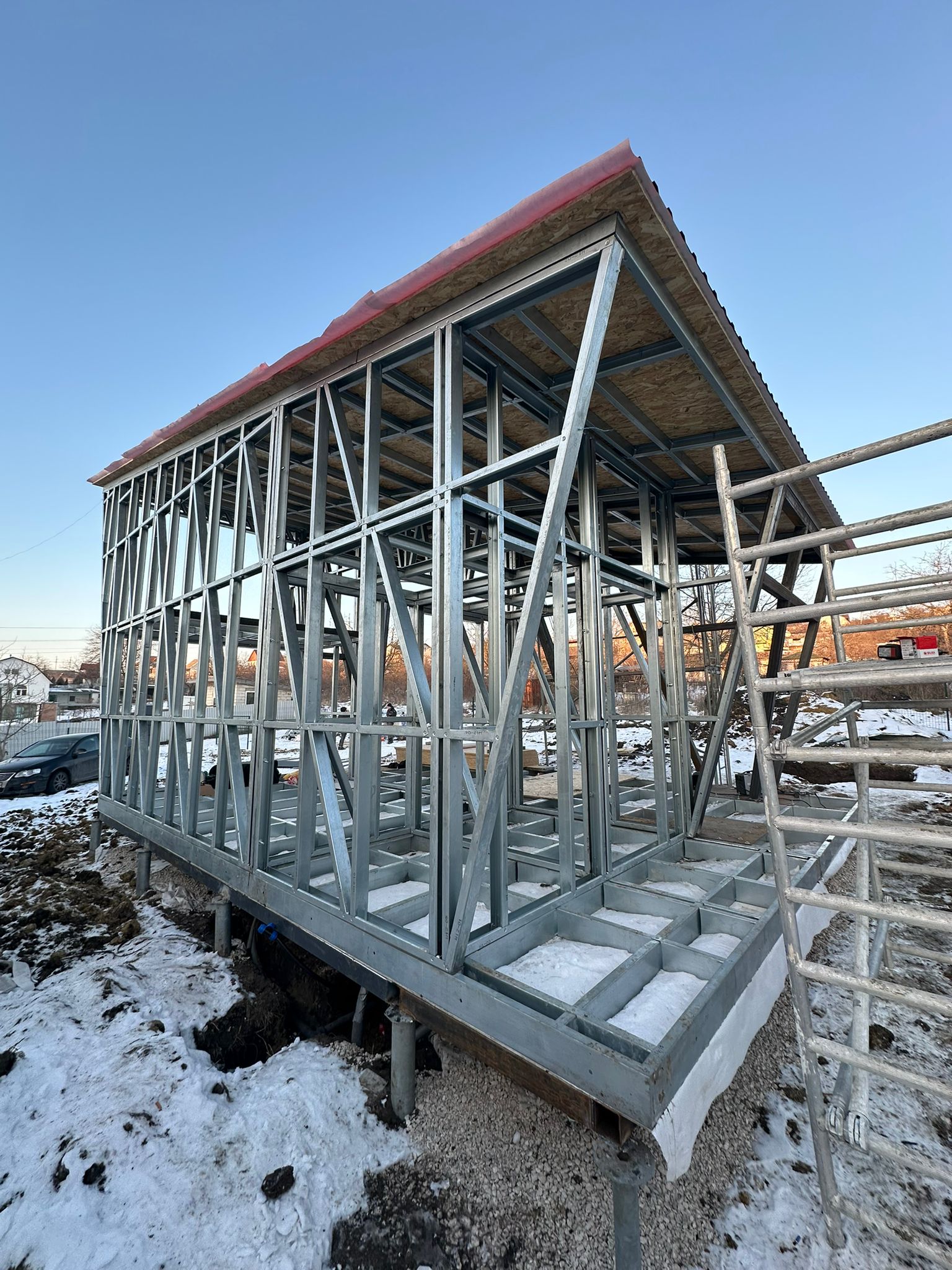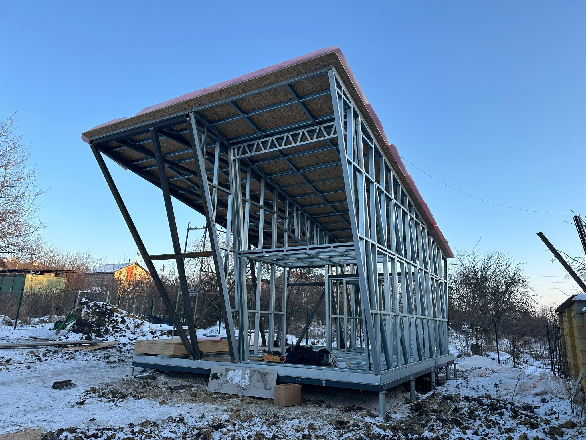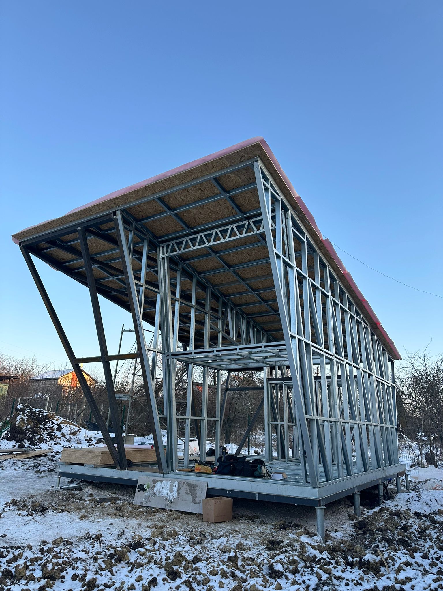 Share with friends Click on the icon to share the link with your friends Asymmetrical 26 m² House + 17 m² Terrace 26 7 Moldova Описание Asymmetrical 26 m² House + 17 m² Terrace Completed in Moldova A modern compact 26 m² house with a 17 m² terrace, built using LGSF (Light Gauge Steel Frame) technology. Structural System Wall, floor, and roof structure — LGSF Mezzanine level — LGSF steel framing Terrace canopy and roof elements — LGSF Foundation — screw piles The screw pile foundation minimized ground works and allowed rapid installation. Architecture Asymmetrical mono-pitch roof design Standing seam metal roofing Full-height panoramic glazing Integrated covered terrace The asymmetrical roof geometry increases internal volume and allows efficient mezzanine layout. Installation The house was fully assembled and installed within 1 week.All components were factory-manufactured and assembled without welding. Advantages of LGSF Technology lightweight structure fast construction precise prefabrication suitable for challenging soil conditions ???? Request a project estimate???? Contact our engineering team Заказать проект