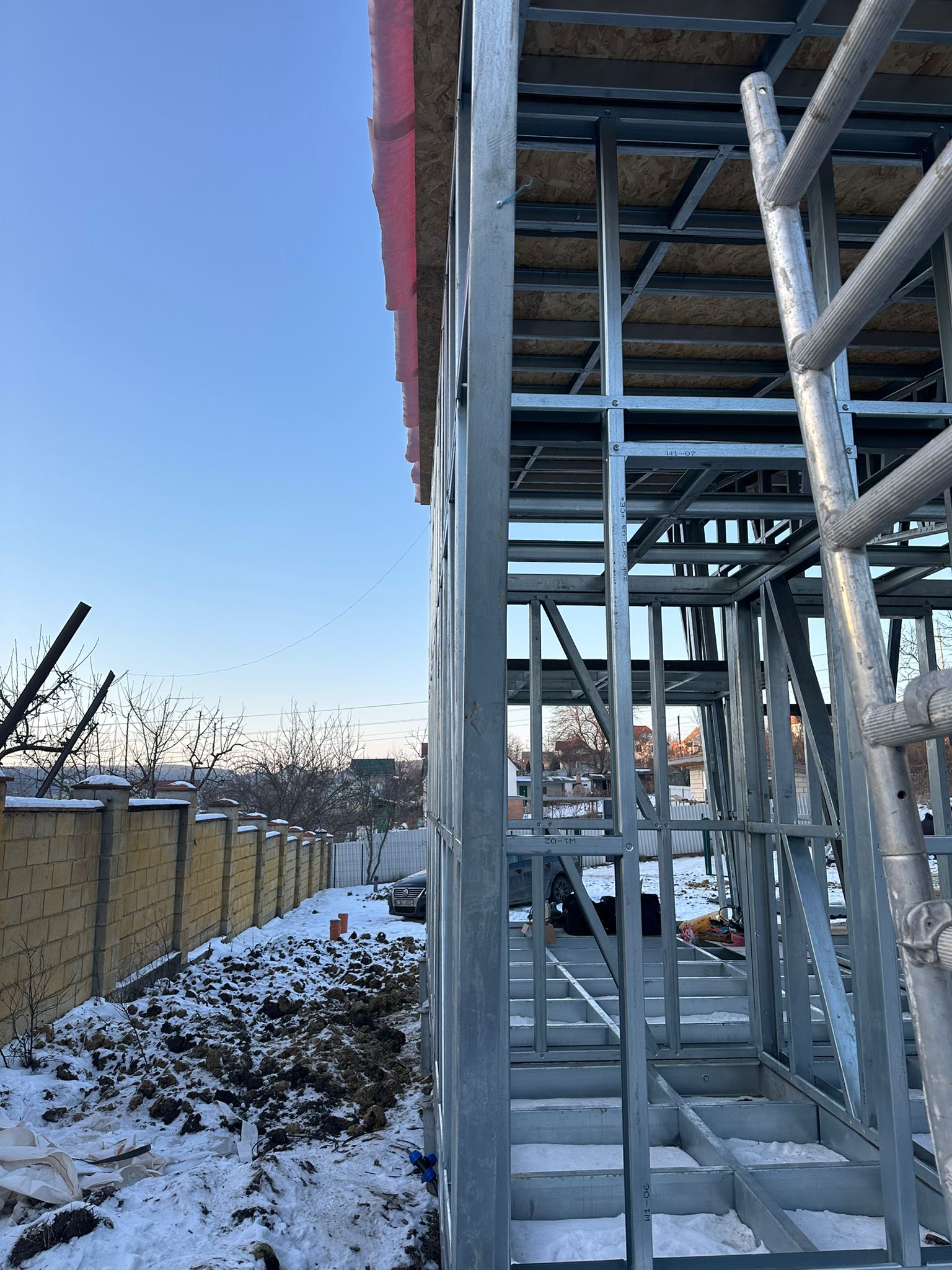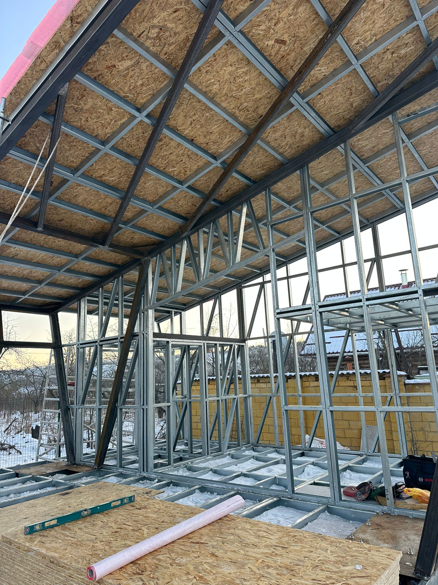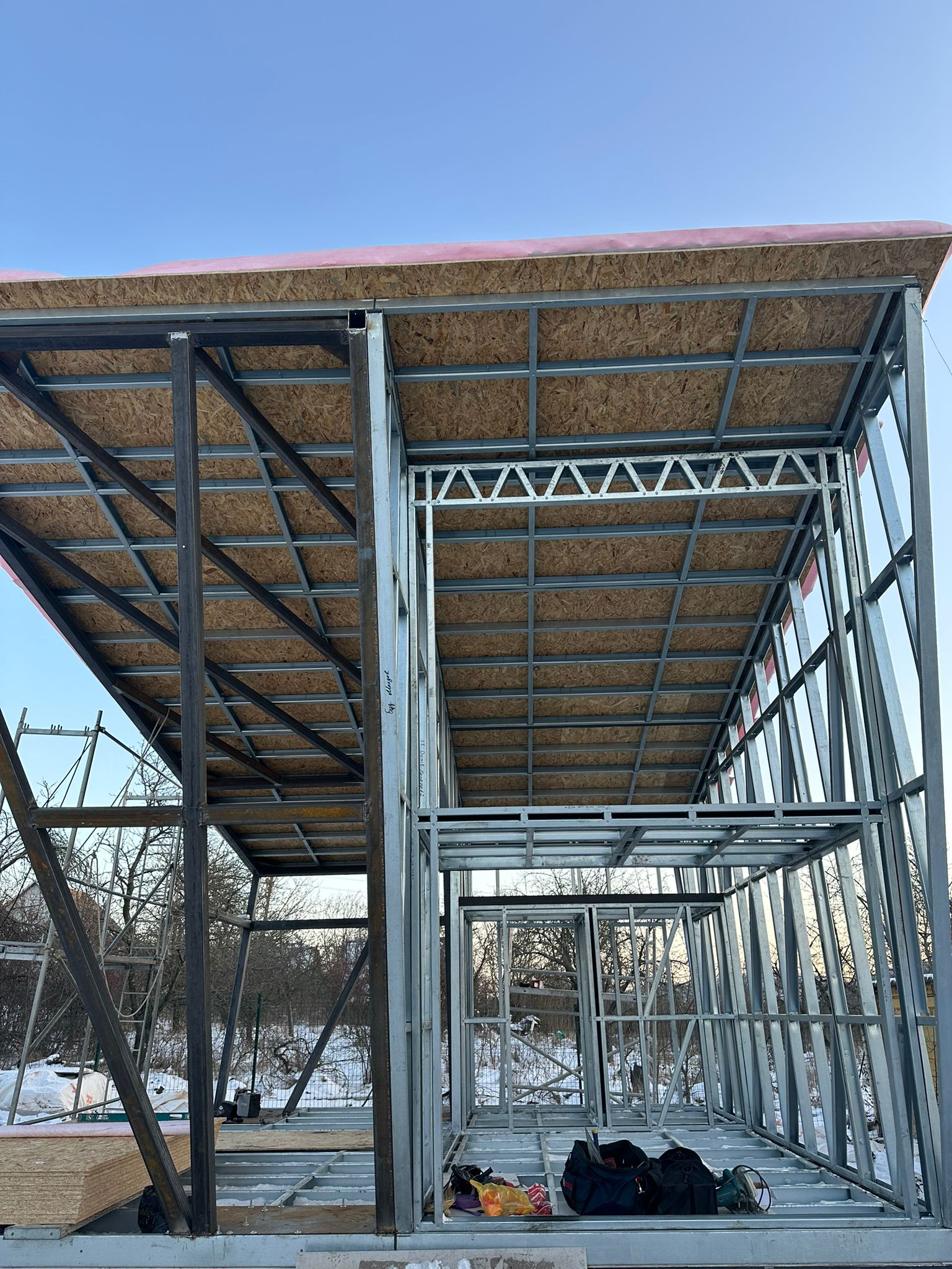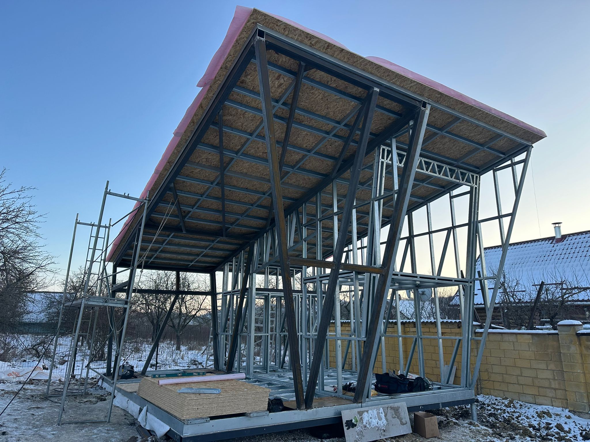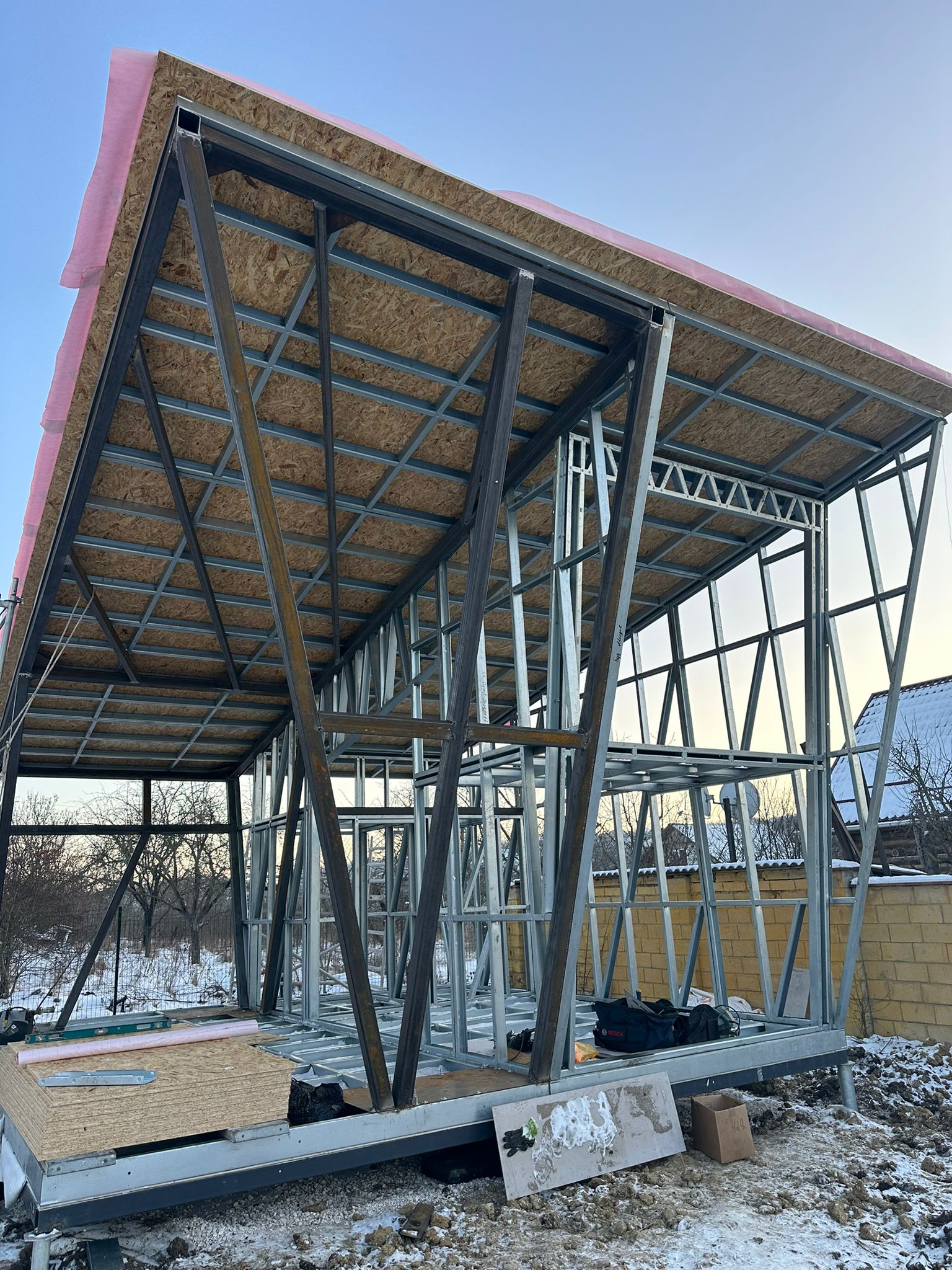 Share with friends Click on the icon to share the link with your friends Asymmetrical 26 m² House + 17 m² Terrace 26 7 Moldova Описание Asymmetrical 26 m² House + 17 m² Terrace Completed in Moldova A modern compact 26 m² house with a 17 m² terrace, built using LGSF (Light Gauge Steel Frame) technology. Structural System Wall, floor, and roof structure — LGSF Mezzanine level — LGSF steel framing Terrace canopy and roof elements — LGSF Foundation — screw piles The screw pile foundation minimized ground works and allowed rapid installation. Architecture Asymmetrical mono-pitch roof design Standing seam metal roofing Full-height panoramic glazing Integrated covered terrace The asymmetrical roof geometry increases internal volume and allows efficient mezzanine layout. Installation The house was fully assembled and installed within 1 week.All components were factory-manufactured and assembled without welding. Advantages of LGSF Technology lightweight structure fast construction precise prefabrication suitable for challenging soil conditions ???? Request a project estimate???? Contact our engineering team Заказать проект